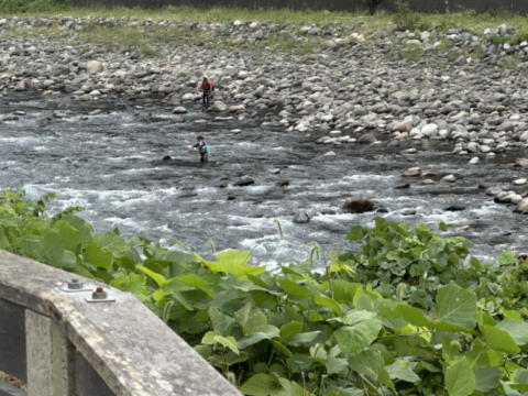 キャンプ場すぐ前の長良川では釣り人が鮎釣りをしていました。