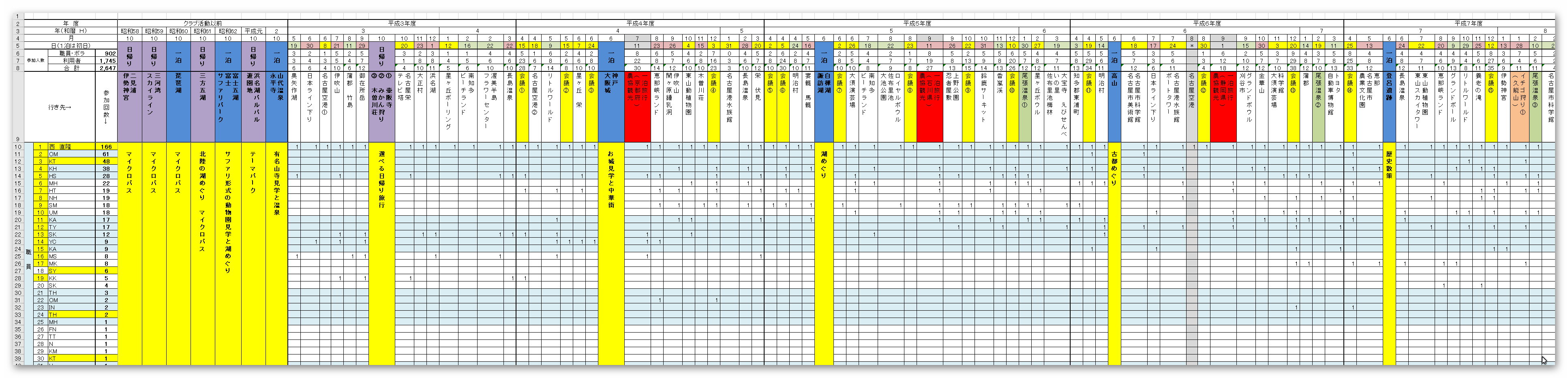 当時の記録を記載します。クラブ創設時から、消滅までのメンバーと行き先をEXCELで記録しています。